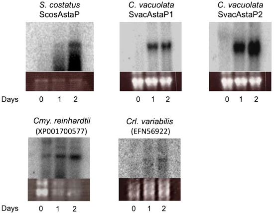 Northern blots of total RNA probed with the gene encoding AstaP orthologs from S. costatus, C. vacuolata, Cmy. reinhardtii, and Crl. variabilis. Strains were cultivated under photooxidative stress conditions. 0, just before the start of stress, 1–2, after one and two days of stress. Gene accession numbers are shown in parentheses. Ethidium-bromide staining of the ribosomal RNA (rRNA) to confirm the equal loading is shown below the autoradiogram.