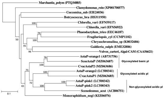 The Scenedesmus actus AstaP ortholog was identified as a translation product of a gene induced by Cr stress [14], but its binding of astaxanthin has not been determined. Phylogenetic analysis revealed that the AstaP orthologs were classified into three groups: glycosylated basic pI, glycosylated acidic pI, and non-glycosylated acidic pI (Figure 8).