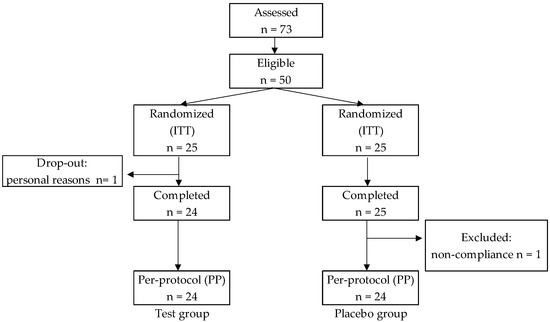 Sample sizes were calculated from previous studies [47]. More than twenty subjects were required per group (type I error (α) = 0.05, 1–β = 0.80). Data normality was checked using a quantile–quantile plot. Bartlett’s test was used to measure the homogeneity of variances. Data were analyzed using JMP (Version 14.0, SAS Institute Inc., Cary, NC, USA). Unpaired t-test, Welch’s t-test, or Wilcoxon rank sum test was used to evaluate: (1) changes from baseline and differences between the changes in the test and placebo groups, (2) differences between the two groups at baseline and 8 weeks. If gender differences were observed in the measurements, these measurements were analyzed after stratification by gender. Serum lipid concentrations were analyzed after stratification by hyperlipidemia and non-hyperlipidemia. In all analyses, a two-sided p-value < 0.05 was considered significant.