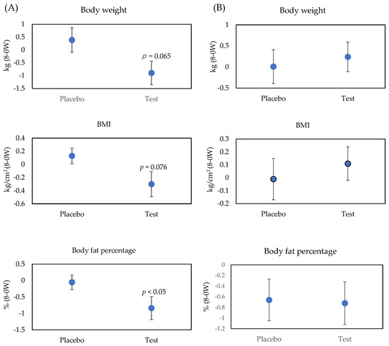 Changes in body weight, BMI, and body fat percentage after 8-week consumption of boiled kelp powder are shown in Figure 2. Anthropometric measurements and visceral fat area are shown in Table S1. These measurements were analyzed after stratification by gender. In males, the decrease in the body fat percentage was significantly greater in the test group compared with the placebo group. The same tendency was observed in body weight (p = 0.065) and BMI (p = 0.072). No significant differences between the placebo group and the test group in visceral fat area or systolic and diastolic blood pressure were observed in males. In females, body weight and BMI showed a small change in the placebo group (0.01 kg and −0.01 kg/cm2), whereas these parameters were increased in the test group (0.24 kg and 0.11 kg/cm2); however, these differences were not statistically significant (p = 0.665 and 0.587). In females, no significant changes were observed in body fat percentage, visceral fat area, or either of the blood pressure measurements.