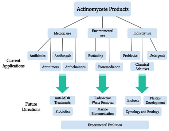 The Actinomycetales order is one of great genetic and functional diversity, including diversity in the production of secondary metabolites which have uses in medical, environmental rehabilitation, and industrial applications. Secondary metabolites produced by actinomycete species are an abundant source of antibiotics, antitumor agents, anthelmintics, and antifungals. These actinomycete-derived medicines are in circulation as current treatments, but actinomycetes are also being explored as potential sources of new compounds to combat multidrug resistance in pathogenic bacteria. Actinomycetes as a potential to solve environmental concerns is another area of recent investigation, particularly their utility in the bioremediation of pesticides, toxic metals, radioactive wastes, and biofouling. Other applications include biofuels, detergents, and food preservatives/additives. Exploring other unique properties of actinomycetes will allow for a deeper understanding of this interesting taxonomic group. Combined with genetic engineering, microbial experimental evolution, and other enhancement techniques, it is reasonable to assume that the use of marine actinomycetes will continue to increase. Novel products will begin to be developed for diverse applied research purposes, including zymology and enology. This paper outlines the current knowledge of actinomycete usage in applied research, focusing on marine isolates and providing direction for future research.