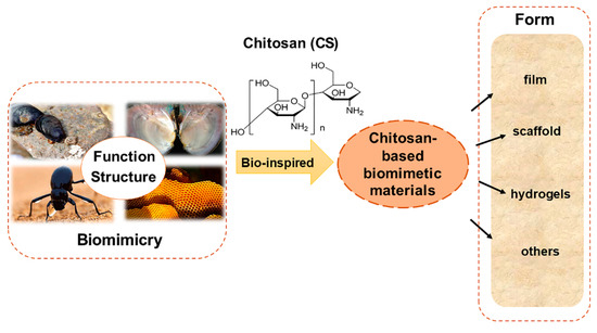 In this paper, the chitosan-based biomimetic materials based on the biological characteristics of bivalves, cell matrices, desert beetles, and honeycomb structure of bees were reviewed. Various forms of biomimetic functional materials (scaffolds, gels, films, and others) based on chitosan have promising applications in the fields of biomedical and adsorptive materials, but many challenges remain in this area. On the one hand, the functional mechanism of some organisms has not yet been fully understood. For example, the biomineralization mechanism of mollusks, such as shellfish, is not yet clear, and bionics is still in its preliminary stages. On the other hand, the long-term biosafety of the prepared materials is not yet clear, for example, whether the retention of the prepared materials loaded with growth factors or drugs will pose a risk to normal tissue growth. Based on the good biological properties and easy modification of chitosan, we believe that a better understanding of the functional mechanisms and safety of the materials involved in the above mentioned organisms, as well as the development of bionics, will greatly benefit the design of intelligent and biosecurity chitosan-based biomimetic materials. We expect that this review will be truly beneficial to the work of aspiring researchers in the field of CS bionics and its related applications.