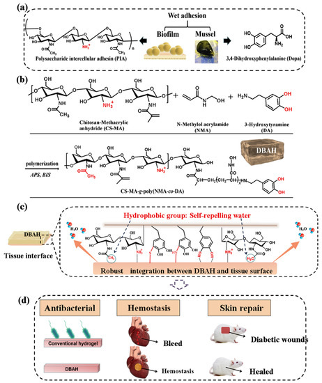 Schematic illustration of design strategy of an engineered biofilm and mussel-inspired dual-bionic adhesive hydrogels (DBAH) and its application for sealing hemostasis and wound healing. (a) The structure of polysaccharide intercellular adhesin (PIA), derived from biofilm, and DOPA, derived from mussel protein, which play a key role in wet adhesion; (b) A biometic biopolymer chitosan, grafted with methacrylate (CS-MA) from PIA; and dopamine, a catecholamine containing a catechol group of DOPA, was conjugated with NMA for hydrogel formation; (c) Schematic illustration of strong underwater bioinspired adhesion base on the self-repelling water function of CS-MA. (d) The multifunctional properties and potential application in in vivo hemorrhage and diabetic wound healing with antibacterial performance. Reproduced with permission from [27], Copyrighter Elsevier 2020.