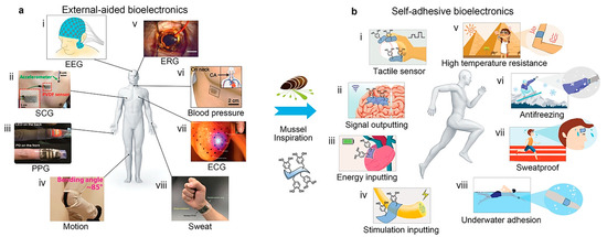 The mussel-like strategy provides novel approaches for wearable/implantable bioelectronics to shift from external auxiliary fixation to convenient and reliable self-adhesion. Reproduced with permission from [84], Copyrighter Wiley 2017.