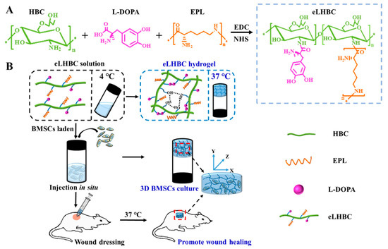 (A) Synthesis scheme of eLHBC conjugate via the binding of carboxyl groups ofl-DOPA and EPL to the NH2 groups of HBC. (B) The formation of eLHBC at 37 °C. BMSCs encapsulated into eLHBC solution at 4 °C and eLHBC as 3D BMSCs culture matrix at 37 °C (BMSCs ⊂ eLHBC). The BMSCs ⊂ eLHBC injected with a syringe on the dorsal wound site of rats and used as wound dressing. Reproduced with permission from [39], Copyrighter Elsevier 2021.