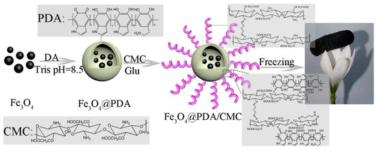 Schematic illustration of the preparation of Fe3O4@PDA/CMC aerogel (polydopamine (PDA), dopamine (DA), Tris (hydroxymethyl)aminomethane (Tris), Carboxymethyl chitosan(CMC), and Glutaraldehyde (Glu)). Reproduced with permission from [64], Copyrighter Elsevier 2021.