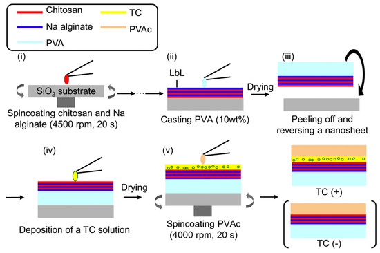 Preparation scheme for TC-loaded nanosheets. (i) Chitosan and sodium alginate were alternately spin coated. (ii) PVA was cast onto the LbL nanosheet. (iii) After drying PVA as a supporting layer, the nanosheet was peeled off with PVA and reversed onto the substrate. (iv) TC solution deposited on nanosheet. (v) After drying to make a TC layer, PVAc was spin coated onto the new layer. Reproduced with permission from [55], Copyrighter Elsevier 2012.