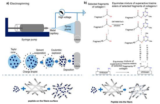 Scheme of applied modification methods of fibrous chitosan substrates: Physical (a) electrospinning was used to apply the solution of human collagen I fragments to the CS non-woven fabric through the potential difference between the nozzle and the collector. The resulting CS with physically embedded fragments of human collagen I (CS/F K1) were fixed using lyophilization. Chemical (b), the coupling reagent, and NMM were added into the peptides solution to activate the peptide, and the non-woven sheet of CS was immersed in the solution containing active peptides to complete the reaction. After washing and drying, the covalent link fragment of the non-woven sheet of CS and human collagen I (CS/C K1) was obtained. Reproduced with permission from [68], Copyrighter Elsevier 2020.