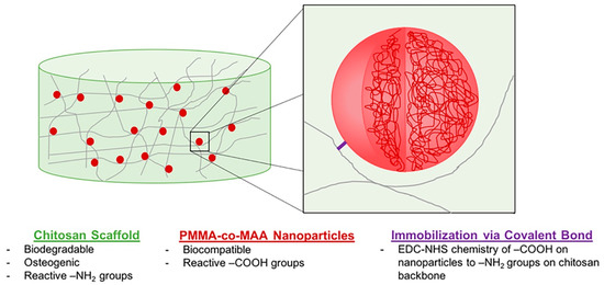 Design of a two-phase NP-scaffold system relying on the immobilization of P(MMA-co-MAA) NPs to a CS scaffold backbone for the sustained delivery of growth factors in bone tissue engineering applications. Reproduced with permission from [24], Copyrighter Wiley 2020.