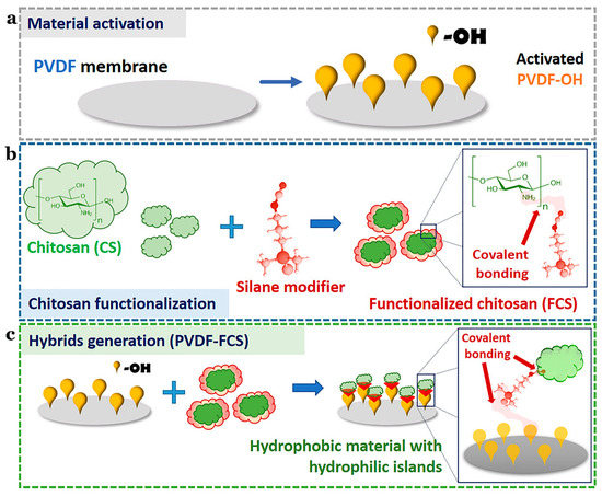 Schematic illustration of the preparation of PVDF-FCS. (a) The reaction for chitosan functionalization. (b) CS was anchored to pre-activated PVDF membranes by urea linker via salinization. (c) The generation of the hybrid materials. Reproduced with permission from [59], Copyrighter Elsevier 2020.