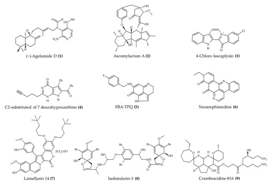 The experiment carried out by Marshall et al. [17] is another example of the anticancer effect of marine alkaloids. In this study, these authors observed a significant reduction in the tumor growth (epidermoid-nasopharyngeal and colon cell lines) in mice treated with neoamphimedine (obtained from marine sponge Xestospongia sp.; compound 6). Another relevant synthetic derivative from marine alkaloids with anticancer potential is lamellarin 14 (inspired by naturally occurring lamellarins from mollusk Lamellaria sp.; compound 7) [18]. This compound reduced the growth of adenocarcinoma in vivo after 17 days of treatment without significant loss of weight.