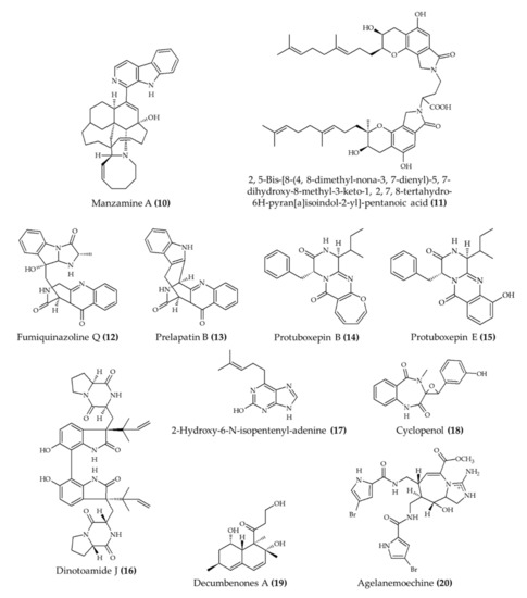 Interesting outcomes were also obtained in a zebrafish model. Fan et al. [23] explored the effect of several alkaloids obtained from the marine fungus Penicillium expansum in controlling blood pressure and inducing angiogenesis. Among all alkaloids, eight compounds displayed the capacity to induce both beneficial effects in the treated group, especially fumiquinazoline Q (12), prelapatin B (13), and protuboxepin B (14) and E (15). Likewise, Li et al. [24] observed a significant increase in the formation of new blood vessels in zebrafish embryos treated with alkaloids extracted from marine fungus Aspergillus austroafricanus. The alkaloids with the highest angiogenic activity were dinotoamide J (16), 2-hydroxy-6-N-isopentenyl-adenine (17), cyclopenol (18), and decumbenones A (19). Similarly, Li et al. [25] observed a similar angiogenic effect in zebrafish treated with agelanemoechine (20), especially at 5 μM, from marine sponge Agelas nemoechinata.