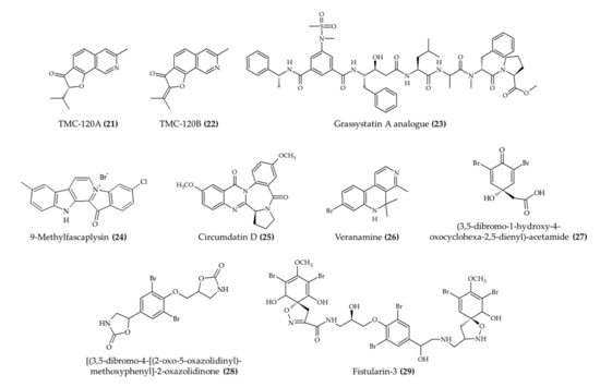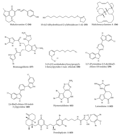 The antimicrobial activity of marine alkaloids was also reported in the study carried out by Rehberg et al. [41] with methicillin-resistant Staphylococcus aureus. These authors observed significant reductions in the size and microbial counts in contaminated skin wounds of animals treated with either 3,3′-(pyrimidine-2,5-diyl)bis(5-chloro-1H-indole) (39) or 2,6-bis(5-chloro-1H-indol-3-yl)pyridine (40) after 12 days. Additionally, these alkaloids also increased the survival rate of animals intraperitoneally injected with methicillin-resistant Staphylococcus aureus by 12 h in relation to control mice (without antibiotic).