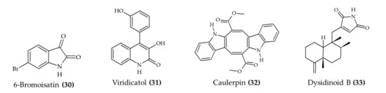 The anti-inflammatory effect of marine alkaloids was also observed in the reduction in the allergic reaction induced by ovalbumin [33]. In this case, viridicatol (20 mg/kg; compound 31) reduced the circulating levels of histamine, mast cell protease-1, and TNF-α, as well as the levels of ovalbumin-specific immunoglobulin E. At the physiological level, the treatment with viridicatol (31) also attenuated the lymphocytic infiltration in the jejunum villi and the degranulation of intestinal mast cells. A similar protective effect was reported by Lucena et al. [34], who reported the anticolitis effect of caulerpin (32) in mice. These authors observed that a dose of 4 mg/kg ameliorated the damage of the inflammatory response in the colon.