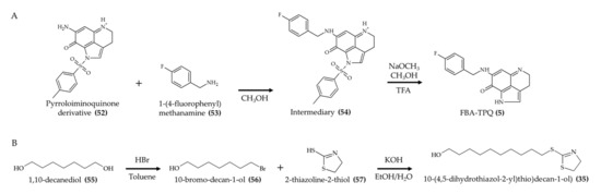 FBA-TPQ (5) is another bioactive alkaloid obtained by chemical synthesis [16]. In order to produce this compound (Figure 7A), the authors reacted a pyrroloiminoquinone derivative (52) [52] with 1-(4-fluorophenyl)methanamine (53) in methanol to generate the intermediary compound (54). Then, this intermediary compound (54) was further reacted with sodium methoxide and methanol in trifluoroacetic acid (TFA) to generate FBA-TPQ (5). A previous experiment from this research group indicated a purity of 99% using this route [53]. A related study carried out by Guimarães et al. [54] reported the chemical synthesis 10-((4,5-dihydrothiazol-2-yl)thio)decan-1-ol (Figure 7B; compound 35). These authors produced this synthetic compound using a two-step reaction. First, 1,10-decanediol (55) reacted with HBr in toluene to generate 10-bromo-decan-1-ol (56) as an intermediary compound. Then, 10-bromo-decan-1-ol (56) was reacted with 2-thiazoline-2-thiol (57) and potassium hydroxide in hydroethanolic solution to produce 10-(4,5-dihydrothiazol-2-yl)thio)decan-1-ol) (35) with a yield of 97%.