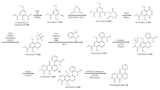 The synthesis of neoamphimedine (6) was successfully completed by Li et al. [55]. These authors proposed starting the synthesis with 2,5-dimethoxy-3-nitrobenzoate (58) with Pd/C to produce the intermediate 8α (Figure 8; compound 59). Subsequently, the intermediate 8α (59) was treated with Meldrum’s acid and trimethyl orthoformate to generate the intermediate 8β (60). Then, the intermediate 8γ (61) was produced via thermal ring closure from compound 8β (60). In the next step, dry dichloromethane and trifluoromethanesulfonic anhydride with dimethyl amino pyridine (as catalyst) were reacted with compound 8γ (61) to generate the intermediate 8δ (62). Once this intermediate was obtained, the Stille coupling reaction with trimethyl-(2-nitrophenyl)stannane was carried out using Pd as catalyst to produce the intermediate 8ε (63). Then, the intermediate 8ζ (64) was produced from a two-step reaction: hydrolyses with lithium hydroxide followed by a coupling reaction with methylamino acetaldehyde dimethylacetal. After this step, an acid-catalyzed ring closure was carried out, which produce the mixture of intermediates 8η and 8θ (quinone (65) and dimetoxy (66) intermediates, respectively). Finally, the neoamphimedine (6) was produced in a two-step reaction: a reduction reaction catalyzed by Pd followed by oxidative demetallation in the presence of ceramic ammonium nitrate. According to the authors, the final step to produce neoamphimedine (6) had a yield of 46%. It is noteworthy that this described route comprised fewer steps than another study on the production of neoamphimedine (6) published by this research group [56].