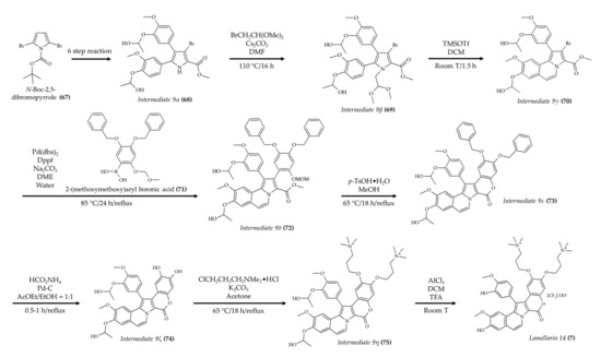 The synthesis of lamellarin 14 (Figure 9; compound 7) was developed by Fukuda et al. [57]. These authors initiated the synthesis by carrying out a six-step reaction using N-boc-2,5-dibromopyrrole (67) to produce the tetra-substituted pyrrole intermediate 9α (68) from a previous study [58]. Once this intermediate was obtained, alkylation with bromoacetaldehyde dimethyl acetal at the pyrrole nitrogen was carried out to yield the intermediate 9β (69). Then, the tricyclic compound 9γ (70) was produced via trifluoromethanesulfonic acid (TfOH)-catalyzed cyclization. This was followed by Suzuki–Miyaura coupling with a 2-(methoxymethoxy)aryl boronic acid (71) to produce the intermediate 9δ (72). A subsequent direct lactonization of O-protected lamellarins was carried out to generate the intermediate 9ε (73). Once this intermediate was obtained, hydrogenolysis was performed to remove the O-benzyl groups and generate the compound 9ζ (74). Then, 3-(dimethylamino)propyl chloride was used to produce the compound 9η (75). Finally, the O-isopropyl groups were removed to produce lamellarin 14 (7). The authors indicated that the last step of lamellarin 14 (7) synthesis had a quantitative yield.