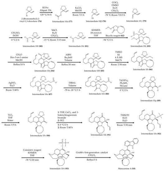 Manzamine A (10) is another marine alkaloid for which chemical synthesis has been achieved. Jakubec et al. [59] synthesized this marine alkaloid by starting with 2-(bromomethyl)-2-vinyl-1,3-dioxolane (76) to generate the key intermediate 10ε (Figure 10; compound 81). Once the compound 10ε (81) was obtained, a reaction with a selected bicyclic reagent (82) took place to produce intermediate 10ζ (83) in the presence of 18-crown-6 and KHMDS. In the following reaction, formaldehyde and hex-5-en-1-amine were used to produce intermediate 10η (84). Then, the nitro group was removed from this intermediate to produce the compound 10θ (85). Subsequently, the intermediate 10ι (86) was produced by adding HI in the double bond via anti-Markovnikov addition. In the next step, silver nitrite was used to produce intermediate 10κ (87). Then, a selective reduction with DIBAL and toluene was applied to produce the intermediate 10λ (88). After the generation of this intermediate, a new ring was formed by using Ti(OiPr)4, Ph2SiH2, and hexane to produce the compound 10μ (89). Subsequently, the intermediate 10ν (90) was generated by replacing the NO2 group with a ketone. Then, a two-step reaction was carried out to add a 3-butenylcerium-derived organometallic substituent and remove the 1,3-dioxolan-2-ylradical from intermediate 10ν (90) and produce compound 10ξ (91). In the subsequent step, the intermediate 10ξ (91) was reacted with TMSOTf in the presence of Et3N and Et2O to generate the compound 10ο (92). After generating this compound, Commin’s reagent, KHMDS, and THF were added to the reaction to produce the intermediate 10π (93), which produced a new ring. Finally, manzamine A (10) was formed (52% yield) with Grubb’s first-generation catalyst in the presence of CH2Cl2 from compound 10π (93). The authors also indicated that a yield of 73% was obtained using this route. Moreover, other authors have provided insights for core structures [60] and additional routes for manzamine A (10) synthesis [61,62,63].