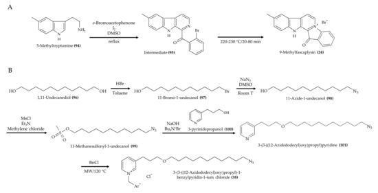 The synthesis of 9-methylfascaplysin (Figure 11A; compound 24) was carried out using 5-methyltryptamine (94) with o-bromoacetophenone in the presence of I2 and DMSO [28]. Once the intermediary adduct product (95) was formed, the reaction mixture was heated to obtain 9-methylfascaplysin (24) by closing an inner ring. A synthetic route to produce 3-(3-((12-azidododecyl)oxy)propyl)-1-benzylpyridin-1-ium chloride (Figure 11B; compound 38) was also proposed by Andrade et al. [40]. In this study, the synthesis was initiated with the reaction between 1,11-undecanediol (96) and HBr in toluene to yield 11-bromo-1-undecanol (97). Then, this compound was reacted with NaN3 in DMSO to produce 11-azide-1-undecanol (98). Next, the addition of a methanesulfonyl group in this compound was carried out to generate 11-methanesulfonyl-1-undecanol (99). Subsequently, 3-(3-((12-azidododecyl)oxy)propyl)pyridine (101) was produced by the reaction between 11-methanesulfonyl-1-undecanol (99) and 3-pyrinidepropanol (100). Finally, the 3-(3-((12-azidododecyl)oxy)propyl)pyridine (101) was reacted with BnCl to generate 3-(3-((12-azidododecyl)oxy)propyl)-1-benzylpyridin-1-ium chloride (38).