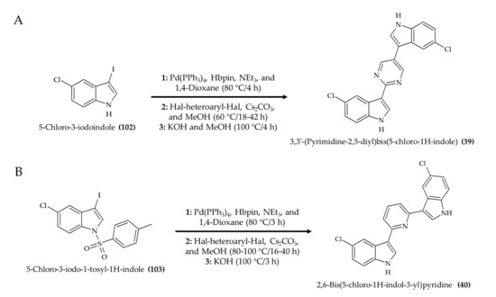 Other relevant synthetic alkaloids are 3,3′-(pyrimidine-2,5-diyl)bis(5-chloro-1H-indole) (39) and 2,6-bis(5-chloro-1H-indol-3-yl)pyridine (40) [41]. The synthesis of 3,3′-(pyrimidine-2,5-diyl)bis(5-chloro-1H-indole) (Figure 12A; compound 39) was possible with a one-pot reaction composed of three steps initiated with 5-chloro-3-iodoindole (102). A similar strategy was applied in the generation of 2,6-bis(5-chloro-1H-indol-3-yl)pyridine (Figure 12B; compound 40) from 5-chloro-3-iodo-1-tosyl-1H-indole (103).