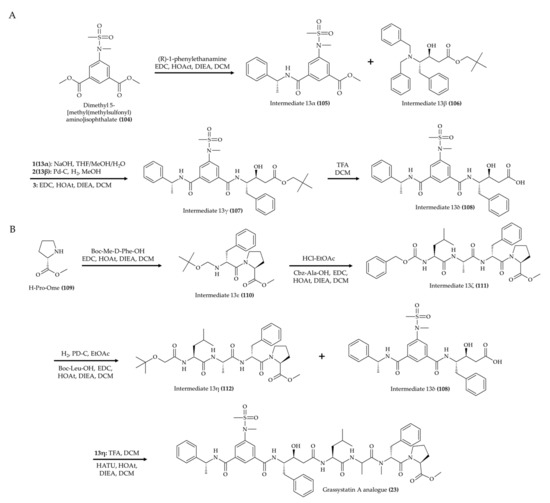 The production of key intermediate 13η (112) was initiated with the reaction between H-Pro-OMe (109) with Boc-Me-D-Phe-OH in the presence of EDC, HOAt, DIEA, and DCM to produce the intermediate 13ε (110) [27]. In the next step, this intermediate was treated with HCl-EtOAc and then coupled to Cbz-Ala-OH (in EDC, HOAt, DIEA, and DCM) to generate the compound 13ζ (111). Subsequently, the key intermediate 13η (112) was generated from the reaction between intermediate 13ζ (111) (treated with H2, PD-C, and EtOAc) and Boc-Leu-OH (in EDC, HOAt, DIEA, and DCM). Finally, intermediate 13η (112) (treated with TFA and DCM) was coupled to intermediate 13δ (108) in HATU, HOAt, DIEA, and DCM to produce the grassystatin A analog (reaction yield of 60%; compound 23).