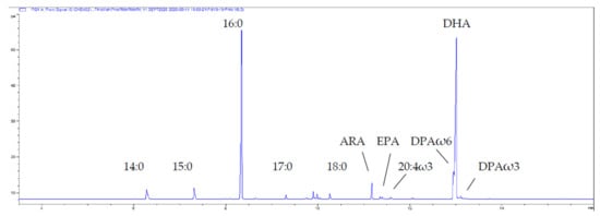Partial gas chromatogram of the total lipid-derived FA (as FAME) of the thraustochytrid Aurantiochytrium sp. strain TC 20. The shoulder on the front of DHA is DPAω6. Abbreviations: Arachidonic acid ARA, 20:4ω6; EPA, 20:5ω3; Docosapentaenoic acid DPAω3, 22:5ω3; DPAω6, 22:5 ω6; DHA, 22:6ω3.