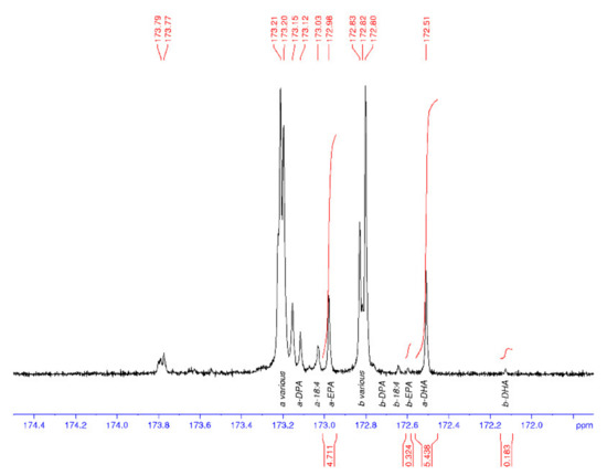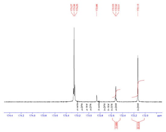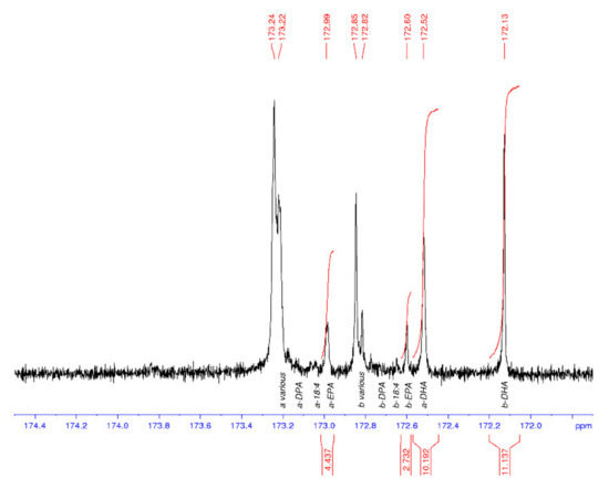 13C NMR spectrum of the carbonyl (C1) region of seal oil with DHA, DPA, and EPA enriched at the sn−1 and sn-3 position (a). a = sn-1,3 and b = sn-2.