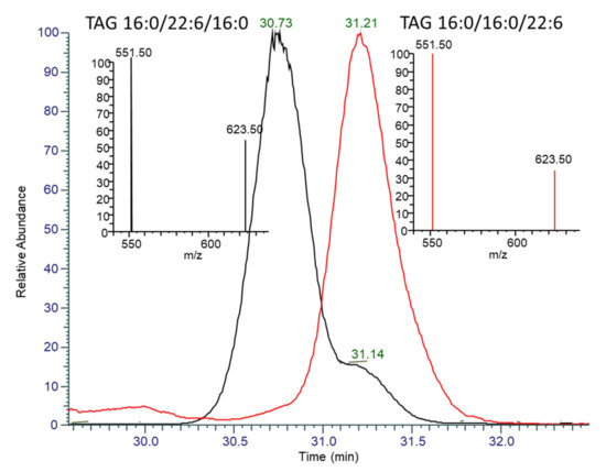 Overlaid extracted ion chromatograms and MS/MS spectra of TAG 54:6 (m/z 896.77) for Table 2. (black) and seal oil (red). The peak at 30.73 min in TC 20 has a MS/MS spectra (inset left, black) indicative of having DHA in the sn-2 position, with the neutral loss of 16:0 at 623.5 m/z being greater than half the abundance of the neutral loss of DHA at 551.5 m/z. The peak at 31.2 min in both seal oil and TC 20 has a MS/MS spectra (inset right, red-seal oil) with a neutral loss of 16:0 less than 40% of DHA, indicating preferential fragmentation of sn-1,3 DHA.