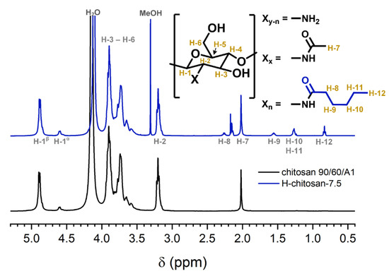 1H NMR spectra of native chitosan 90/60/A1 (black) and H-chitosan-7.5 (blue) with peak assignments to corresponding protons (H-1α and H-1β for anomeric structures, see Scheme S3). The 1H NMR spectra of H-chitosan-6.0, H-chitosan-6.5, H-chitosan-7.0, H-chitosan-7.5, and H-chitosan-8.0 are shown in Figure S3.