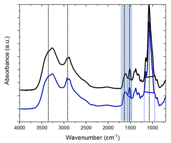 ATR-FTIR spectra of thin films of native chitosan 90/60/A1 (black) and H-chitosan-7.5 (blue) with diagnostic IR bands (left to right): νOH, νCH2, Amide I, δ(NH3+), ν(C-O), blue area subjected to LSA (all H-chitosan spectra in Figure S5).