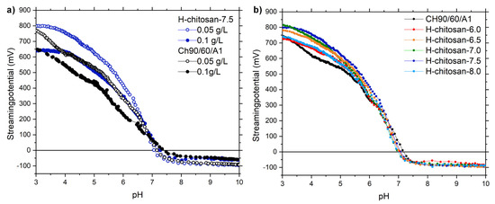 Streamingpotential vs. pH for (a): native chitosan 90/60/A1 at 0.05 g/L (black, open sphere), 0.1 g/L (black, full sphere), H-chitosan-7.5 at 0.05 g/L (blue, open sphere), and at 0.1 g/L (blue, full sphere). Streamingpotential vs. pH at 0.05 g/L for (b): native chitosan 90/60/A1 (black), H-chitosan-6.0 (red), H-chitosan-6.5 (orange), H-chitosan-7.0 (green), H-chitosan-7.5 (blue), H-chitosan-8.0 (light blue).