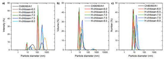 To further investigate the self-aggregation properties in solution, all solved samples were investigated by dynamic light scattering (DLS) measurements. For the samples solved at r.t. for 24 h, the distributions are depicted in Figures S9–S11, whereby the larger, optically visual, non-solved particles were not captured by the method. The samples solved using the improved method (50 °C, 24 h, ultrasonic bath for 2 h) are shown in Figure 4. All chitosan samples featured a bimodal size distribution in the intensity curve, as shown in Figure 4a. The smaller particles were in the range of 10–40 nm in diameter, and the larger particles possessed particles diameters of several hundred nanometers. However, the volume and number curves clearly show just the small particles yielding in an extremely small ratio of larger particles shown in the intensity curve. Thus, the average particle sizes according to the number distribution were around 8 nm for H-chitosan-6.0, H-chitosan-6.5, and H-chitosan-7.0; around 10 nm for Ch90/60/A1; and around 18 nm for H-chitosan-7.5 and H-chitosan-8.0. H-chitosan-6.0, H-chitosan-6.5, and H-chitosan-7.0 featured smaller particles in comparison to the native chitosan because the solubility of the H-chitosan samples decreased. H-chitosan-7.5 and H-chitosan-8.0 exhibited the highest DS% values, resulting in an increased agglomeration number of polymer chains per particle to further compensate for the decreased solubility. It is already known that H-chitosan samples form self-aggregated particle structures in aqueous conditions [26]. The influence of the pH of the solution on the particle size has already been studied by Pa and Yu [27]. The DLS intensity curves at pH 1.55 are in agreement with the size distribution shown in Figure 4.
