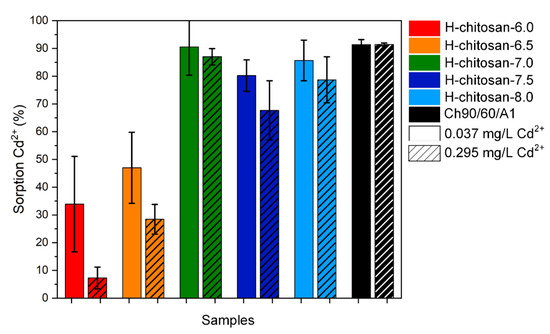 Adsorption of the different H-chitosan samples using the initial Cd2+ concentrations of 0.037 mg/L (plain) and 0.295 mg/L (striped). The corresponding pH values of the solution before and after the adsorption as well as the pH values of the H-chitosan samples in ultrapure water are shown in Figure S15.
