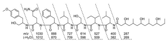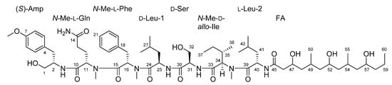 The structure of 1 has many features that resemble minnamide A, a cyanobacterial natural product recently reported from a sample of Okeania hirsuta that was collected in Minna island, Okinawa Prefecture, Japan []. However, noteworthy differences in the structures (Figure 8) include a different length polypeptide core scaffold, where minnamide A has an N-Me-Val–Ser–N-Me-Val moiety instead of the N-Me-Phe group present in 1, as well as a longer fatty acid tail that contains an additional PKS-like repeating unit described above (repeats 3x in 1 and 4x in minnamide A). Accordingly, the molecular weight of minnamide A is 238 Da higher than that of 1, and these molecules have significantly different MS/MS spectra due to the multiple structural differences. However, the hydrolysis of an aliquot of 1, and subsequent analysis by chiral HPLC along with standard compounds, supported the assignment of the same configuration for all shared amino acid residues and derivatives from minnamide A, specifically (S)-Amp, N-Me-l-Gln, d-Leu-1, d-Ser, N-Me-d-allo-Ile, and l-Leu-2. Comparison of the NMR data obtained for 1 in pyridine-d5 (see Supplementary Table S1) with published values for minnamide further supported these assignments []. The N-Me-Phe residue (present in 1 and absent in minnamide A) was determined to be that of the l form by the same protocol. It is hypothesized that the configuration of the repeating PKS-like subunits of the fatty acid chain in 1 match with those reported for minnamide A; however, this has not been established empirically in the present study. In total, this information was used to assign the absolute configuration of the peptide core scaffold of 1 as presented in Figure 1 and Figure 8.
