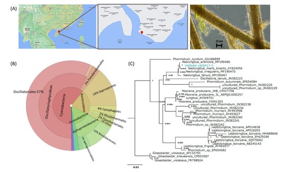 Sample information. (A) Collection site and morphology of HAINAN-19SEP17-3. (B) Microbiome analysis; the order Oscillatoriales contains the families Oscillatoriaceae and Phormidiaceae, and this higher taxonomy is presented here to avoid confounding basionyms within these two. (C) Phylogeny of the environmental assemblage dominated by cf. Neolyngbya sp. from the South China Sea that was evaluated in this study. Map generated with Google Earth. Taxonomy and phylogeny were evaluated using Silva and EMBL-EBI databases. Gleobacter was used as the outgroup.