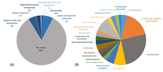 Chemical space of the organic extract of cf. Neolyngbya sp. HAINAN-19SEP17-3 as evaluated by data-dependent LC-MS/MS. Samples were analyzed via the GNPS platform using NAP, Dereplicator and MolNetEnhancer workflows to yield putative annotations of (A) SuperClasses and (B) SubClasses of annotated molecular features based on observed fragmentation patterns.
