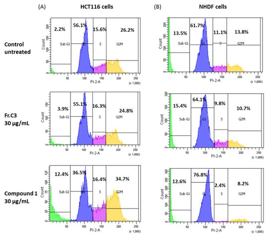 To clarify the cell viability decrease following 24 h treatment with C3 and 1 (30 µg/mL), cell cycle distribution analysis was examined. A FACS analysis demonstrated that treatment with C3 and 1 resulted in the accumulation of cells in the sub-G1 phase of the cell cycle at 3.9% and 12.4%, respectively, compared to 2.2% in the untreated (control) cells (Figure 4A). Furthermore, the cells were observed to be accumulating at the G2/M phase following treatment with 1 (34.7% vs. 26.2% in the control), indicating suppression of cell proliferation. Normal, non-cancerous colon cell lines are unavailable. However, the same pattern of cell cycle arrest was not observed when the samples were tested in normal human dermal fibroblasts (NHDF; Figure 4B).