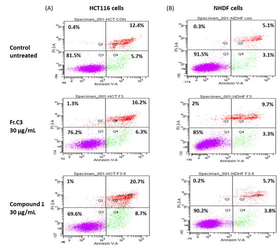 The cell cycle arrest at the G2/M phase accompanied by an accumulation in the sub-G1 phase observed due to treatment with C3 or 1 is suggestive of apoptotic cell death, since this has been reported previously for human colon cancer cells []. In order to confirm this hypothesis, HCT116 cells were treated with 30 µg/mL C3 or 1 for 24 h, stained with FITC labeled Annexin-V and PI, and analyzed by flow cytometry (Figure 5A). The results indicated an increase of approximately 4.4% in apoptotic cells (Q2 + Q4) following treatment with C3, and about 11.3% after exposure to 1. Annexin/PI double staining analysis of NHDF cells in vitro showed a similar increase in accumulation of apoptotic cells after treatment with fraction C3, of about 4.8%, but a much smaller increase following treatment with compound 1, of about 1.3%, in comparison to untreated cells (Figure 5B).