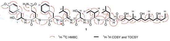 Compound 1 was obtained as a white powder and assigned the molecular formula C64H106N8O14 based on a sodium adduct peak in the HRESIMS spectrum at m/z 1233.7748 [M + Na]+ (calcd. for C64H106N8O14Na+, 1233.7721). This formula indicated that 1 possessed 16 degrees of unsaturation. The 1H and 13C NMR data of 1 (Table 1) were suggestive of a lipopeptide scaffold with seven sets of signals characteristic of amino acid α protons, as well as two aromatic rings, two oxygenated methylenes, three oxygenated methines, one methoxy and three N-methyl groups, along with many alkyl moieties and eight amide carbonyls. The region measured from δH 3.8 to 4.9 ppm had sufficient peak resolution to nucleate seven amino acid and derivative substructures that were able to be constructed using 1D and 2D NMR data. For example, an “α proton” signal at δH 3.91 (H-2) was connected to a carbon at δC 52.4 (C-2) with the evidence of a peak in the 1H-13C HSQC spectrum. After examination of the 1H-1H COSY spectrum and HSQC data, this methine was determined to be adjacent to an oxygenated methylene group, CH2-1 (δC 62.7, δH 3.35), and a benzylic methylene group, CH2-3 (δC 35.6, δH 2.77 and 2.53). The assignment of the aromatic ring connected to C-3 was completed by further inclusion of long-range coupling data obtained from the 1H-13C HMBC spectrum. As shown in Figure 6, this para-methoxy-substituted phenyl group was characterized by correlations observed between H2-3 and C-5/9, H-5/9 and C-7, H3-7-O-Me and C-7, as well as H-6/8 and C-4. The planar structure of this subunit was thus established as 2-amino-3-(4-methoxyphenyl)propan-1-ol; “Amp”.