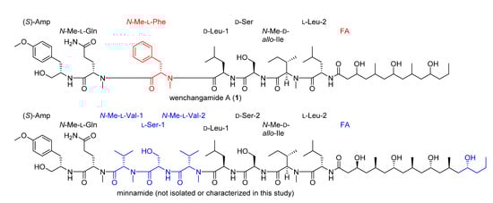 Structural comparison of wenchangamide A (1) and minnamide. Shared structural motifs are drawn in black. Differences in 1 are highlighted in red. Differences in minnamide are highlighted in blue. Configurations from the shared part of the FA residue in 1 are hypothesized to match those of minnamide.