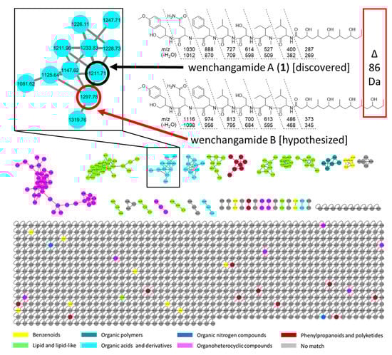 The GNPS-produced LC-MS/MS molecular network highlights molecules with a potential structural similarity as “molecular families”, based on fragmentation patterns. The cluster that contained wenchangamide A (1) suggested the presence of further analogue molecules in the extract. One of these compounds presented an m/z value of 1297, which is 86 Da higher than that of 1 in the same experiment. Upon closer examination of the MS/MS spectra and fragmentation ions related to the “y” ions produced from amide bond backbone cleavages, it was determined that the entire difference of 86 Da between the m/z 1297 molecule and 1 was located on the FA residue. Since this same mass difference corresponds to one additional repeating unit of a PKS-like moiety present 3x in 1, akin to the 4x in minnamide A, the corresponding “hybrid” molecule, wenchangamide B, is here hypothesized (Figure 9). While the structure of this molecule contains the same FA moiety from minnamide A, it has the same polypeptide core as 1, and is accordingly assigned the trivial name, wenchangamide B. Although fragmentation data from mass spectrometry cannot distinguish between configurational isomers of peptides, and even some constitutional isomers (e.g., Ile, Leu, and N-Me-Val), the structure of wenchangamide B is proposed as drawn, based on biosynthetic logic. This molecule was not able to be isolated in pure form in sufficient quantity for empirical structural characterization in this study, and is suggested for targeted isolation, structure elucidation, and more accurate pharmacological characterization in future research. This strategy of structure proposal based on MS/MS fragmentation analysis and molecular networking for compounds beyond isolation in the initial study, later followed by targeted isolation or synthesis for confirmation and structure-activity relationship (SAR) study, has been recently exemplified by Gerwick, Luesch, and coworkers in the expansion of the cyanobacterial natural product family of doscadenamides [,,].