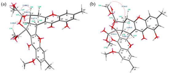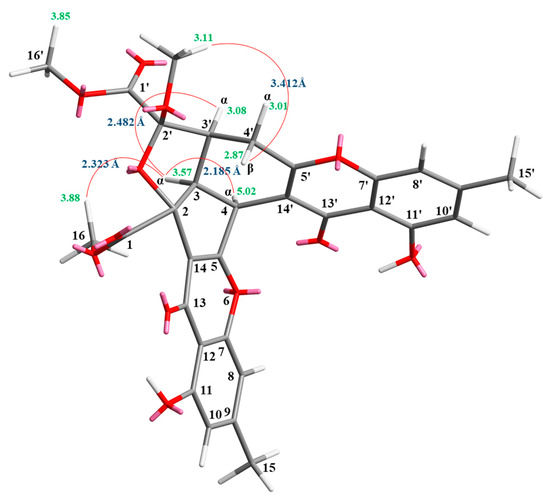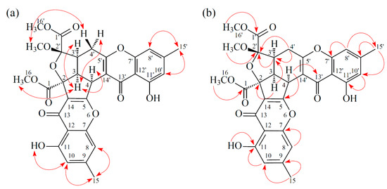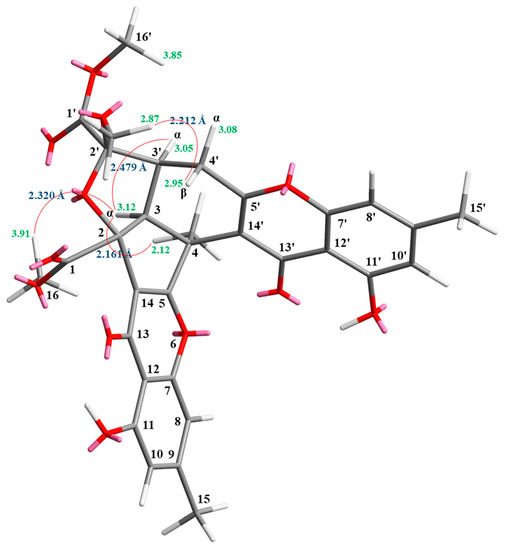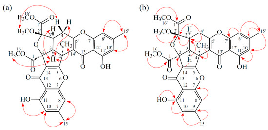 Compound 3 was isolated as an amorphous powder. The ESI–MS displayed the quasi-molecular ion [M + Na]+ at m/z 627, suggesting a molecular formula of C32H28O12, which was elucidated by the HR–ESI–MS (m/z 627.14731 [M + Na]+, calcd. 627.14784) and by the 1H and 13C NMR data. The IR spectrum showed the presence of hydroxyl (3420 cm−1), ester carbonyl (1761 and 1740 cm−1), and the conjugated carbonyl (1657 cm−1) groups. The signals at δ 12.14 and 12.99 exhibited two chelated hydroxyl groups with the carbonyl group. Comparison of the 1H and 13C NMR data of 3 with those of epiremisporine F (1) suggested that their structures were closely related, except that the 4α-methyl group of 3 replaced the 4α-hydrogen of 1. This was substantiated by both HMBC correlations between Me-4α (δH 2.12) and C-3 (δC 54.1), C-4 (δC 47.9), C-5 (δC 174.3), and C-14′ (δC 114.8), and ROESY correlations between Me-4α (δH 2.12) and Hα-3 (δH 3.12) and Hα-4′ (δH 3.08). The relative configuration of 3 was confirmed by ROESY experiments. The ROESY cross-peaks between Me-4α/H-3, Me-4α/Hα-4′, H-3/H-3′, H-3/Hα-4′, OMe-2′/Hβ-4′, and H-3/COOMe-2 suggested that H-3, Me-4, H-3′, and COOMe-2 were α-oriented, and OMe-2′ was β-oriented. To further confirm the relative configuration of 3, a computer-assisted 3D structure was obtained by using the molecular-modeling program CS CHEM 3D Ultra 16.0, with MM2 force-field calculations for energy minimization. The calculated distances between H-3/Me-4 (2.161 Å), H-3/H-16 (2.320 Å), H-3/H-3′ (2.479 Å), and OMe-2′/Hβ-4′ (2.212 Å) were all less than 4 Å (Figure 6). This was consistent with the well-defined ROESY observed for each of these H-atom pairs (Figure 6). Compound 3 showed similar CD Cotton effects [207.5 (Δε +12.33), 229.5 (Δε −6.57), 263.0 (Δε +20.13), 290.5 (Δε −7.81), and 332.0 (Δε +6.57) nm], compared to the literature data [5]. Thus, 3 possessed a 2S,3R,2′S,3′S-configuration. The 1H and 13C NMR resonances were fully assigned by 1H–1H COSY, ROESY (Figure 7a), HSQC, and HMBC (Figure 7b) experiments. Based on the above data, the structure of 3 was elucidated, as displayed in Figure 1, and named epiremisporine H.