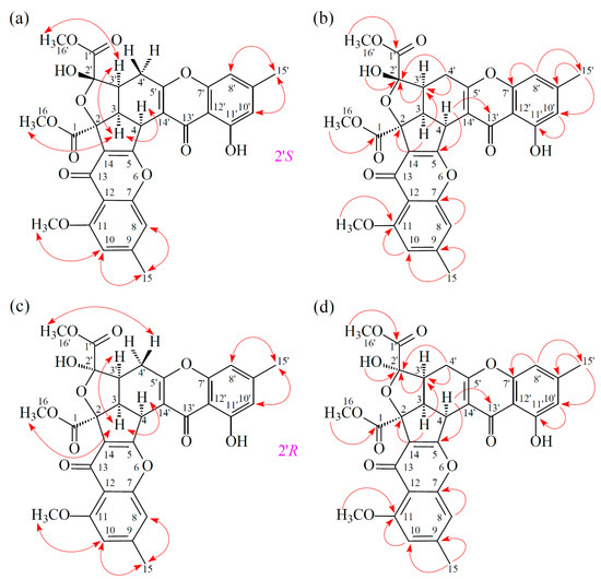Key ROESY (a) and HMBC (b) correlations of 2 (2′S). Key ROESY (c) and HMBC (d) correlations of 2 (2′R).