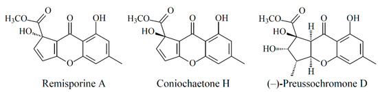 The chemical structures of remisporine A, coniochaetone H, and (−)-preussochromone D.