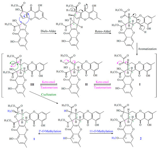 The hypothetic biosynthesis scheme of 1 and 2.
