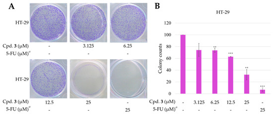 Effect of epiremisporine H (3) on the colony formation of HT-29 cells. (A) The effect of 3 against HT-29 cell colony formation. Clonogenicity was assessed by the monolayer colony formation assay. Representative images show the blue colonies of HT-29 cells stained with crystal violet. (B) Histogram presentation of HT-29 cell colony quantification. ** p < 0.01; *** p < 0.001 compared with the control. a 5-FU (5-fluorouracil) was used as a positive control. Cpd. 3 means compound 3 (epiremisporine H).