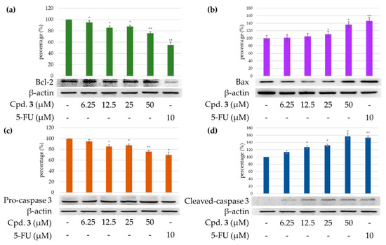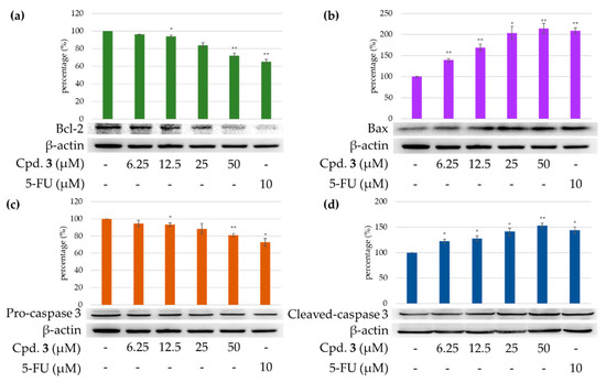 Immunoblot analysis for Bcl-2 (a), Bax (b), pro-caspase 3 (c), and cleaved caspase 3 (d) in each group on HT-29 cells. Treatment with epiremisporine F (3) significantly decreased the expression levels of Bcl-2 and pro-caspase 3, and raised the expression levels of Bax and cleaved caspase 3. Asterisks indicate significant differences (* p < 0.05 and ** p < 0.01) compared with the control group. Cpd. 3 means compound 3 (epiremisporine H).