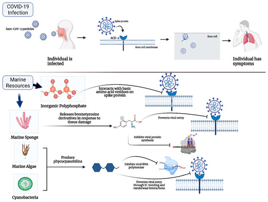 Overview of Sars-CoV-2 infection and various marine compounds that have anti-viral properties. Top half depicts the process of Sars-CoV-2 Infection. Viral particles enter the individual’s airways, where the spike proteins bind to human ACE-2 receptors on the surface of our cells. In this way, the viral particles enter the host cell causing an inflammatory response and manifesting symptoms. Bottom half depicts how several marine resources have anti-viral properties serving as promising therapeutic resources. [Created with BioRender.com accessed on 21 June 2021].