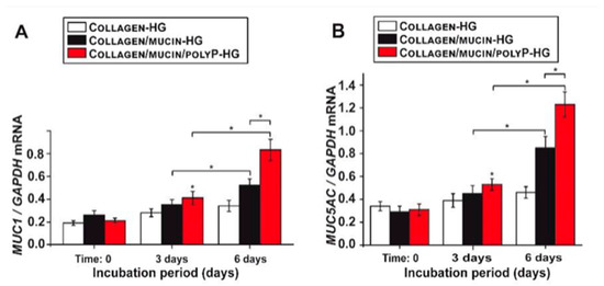 Expression of MUC1 and MUC5AC genes in A549 cells over 6 days. (A) Relative expression of MUC1 incubated for 3 and 6 days. (B) Relative expression of MUC5AC incubated for 3 and 6 days [21].