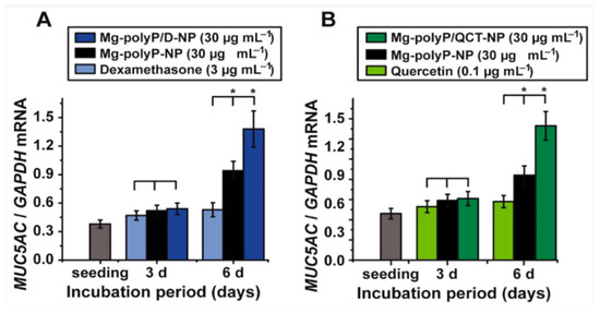 Expression of MUC5AC genes in A549 cells. (A) Cells were exposed to 3 μg mL−1 of dexamethasone, 30 μg mL−1 of polyP and dexamethasone (“Mg-polyP/D-NP”) or 30 μg mL−1 of polyP (“Mg-polyP-NP”). (B) Cells were exposed to 0.1 μg mL−1 of quercetin, 30 μg mL−1 of polyP and quercetin (“Mg-polyP/QCT-NP”) or 30 μg mL−1 of polyP (“Mg-polyP-NP”) [22].